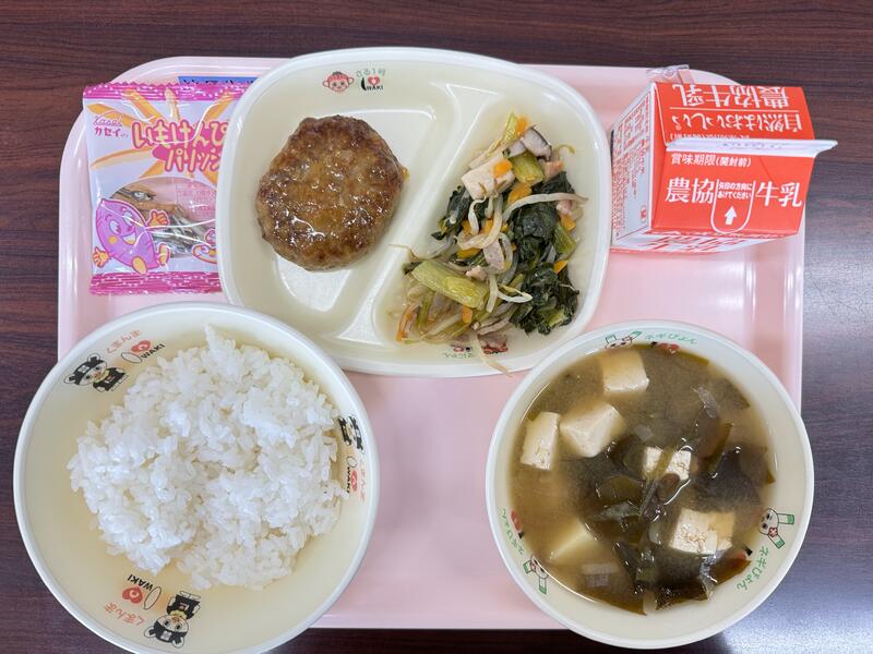 今日は、牛乳、ごはん、ハンバーグお母さんソースかけ、小松菜とエリンギのソテー、ジャガイモの味噌汁、小魚が出ました。