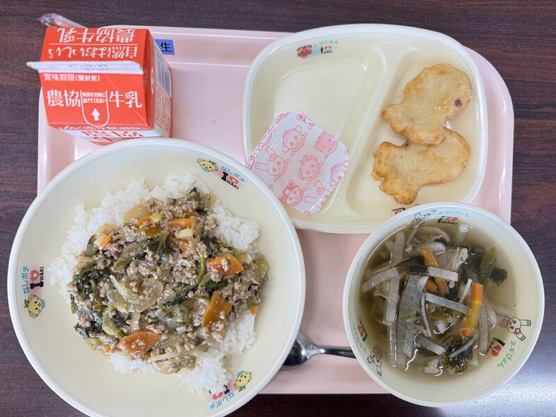 今日は、牛乳、野菜のうま味噌丼、たこナゲット、沢煮わん、県産リンゴセリーが出ました。