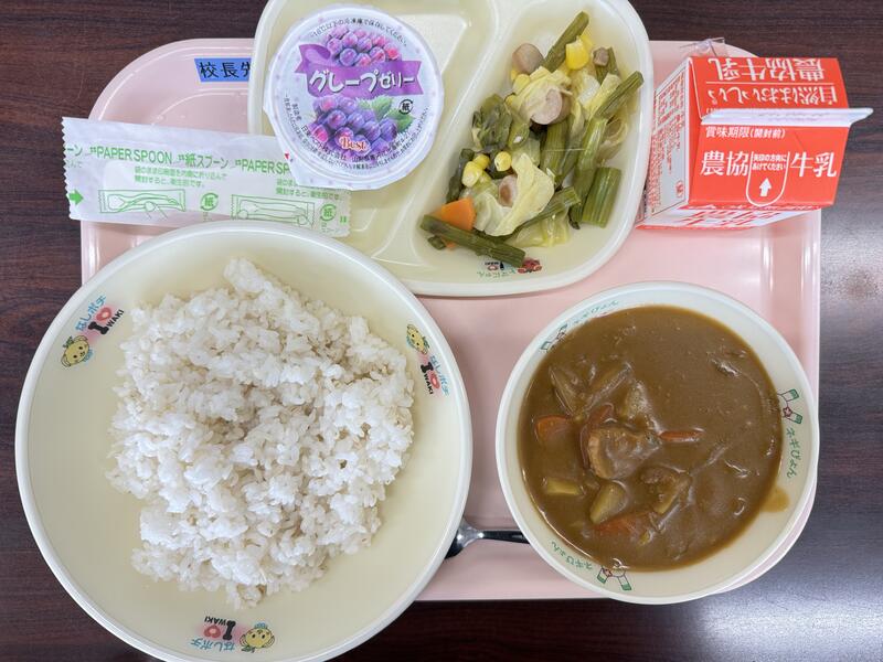 今日は、牛乳、ポークカレーライス、アスパラとコーンのソテー、グレープゼリーがでました。
