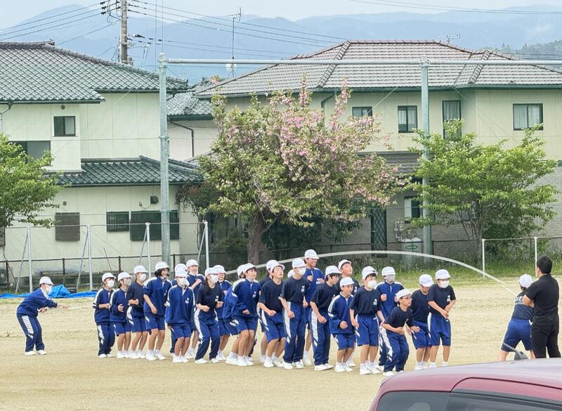 体育で長縄跳びの練習が始まり、それぞれの学級で息を合わせて跳ぶ練習をしています。