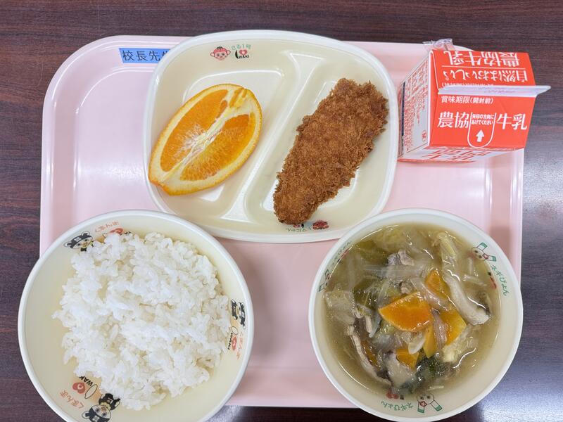 今日は、牛乳、ごはん、ささみカツ、チャプスイ、オレンジが出ました。