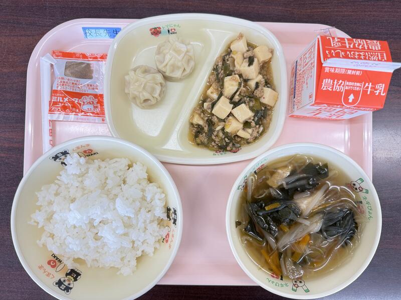 今日は、コーヒー牛乳、ごはん、包子(パオズ)、麻婆豆腐、春雨ともやしのスープが出ました。