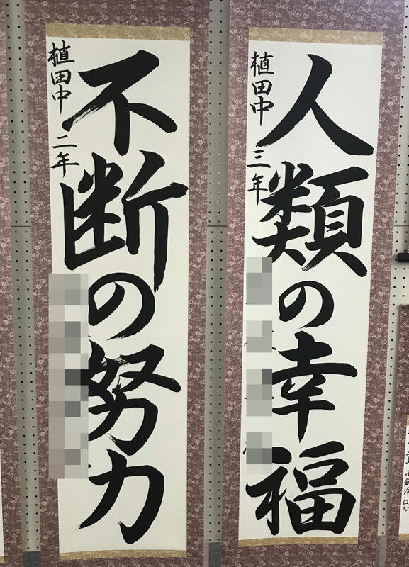 植田中学校からは、半紙の部3名、条幅の部2名の作品を特別賞候補として出品しました。あいにく特別賞受賞は叶いませんでしたが、それぞれの作品の筆遣いは堂々として力強いものであり、見る者を魅了しました。