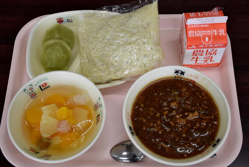 本日の給食は、ジャージャー麺に牛乳、ほんれん草入り餃子2個、キラキラカクテルです。