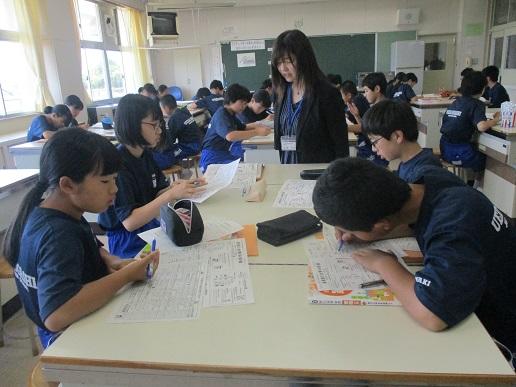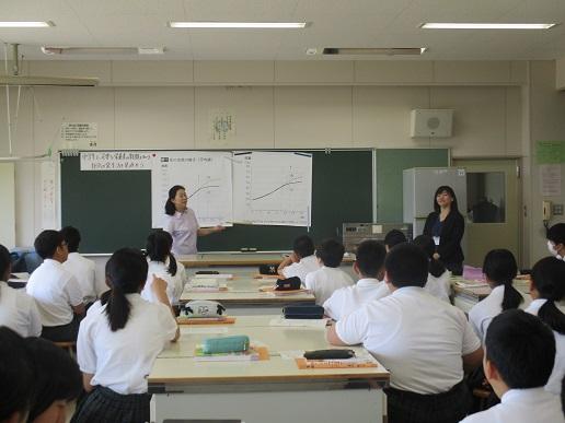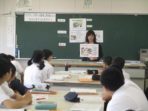 2019年6月26日 15時00分本日26日(水)の3,4校時に1年生を対象に「食に関する指導」を栄養教諭の新妻祐美様を講師に迎え、実施しました。タイトルは「食生活と栄養 中学生に必要な栄養について考えよう」で目的は、成長期の中学生の時期に必要な栄養素についての理解を深め、自分の食生活を振り返り給食の食べ方を見直すことで生徒たちは真剣に話を聴いていました。