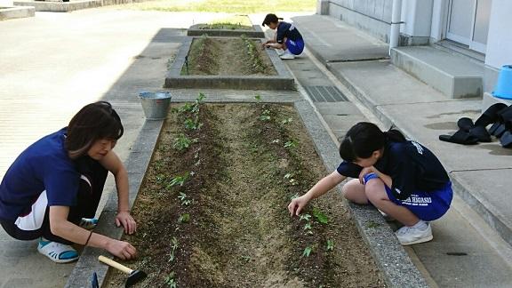 【先生と一緒に、以前植えた朝顔がすくすく育つように間引きをしているのかな?】