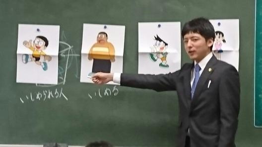 ドラえもんの登場人物では、ジャイアン(いじめをする人)、のび太(いじめられる人)、スネ夫(そそのかす人)、しずか(見てる人)という設定で生徒に考えさせていました。特にスネ夫やしずかのように直接関係していない周囲側に着目して、どんなことができるかを話し合わせていました。