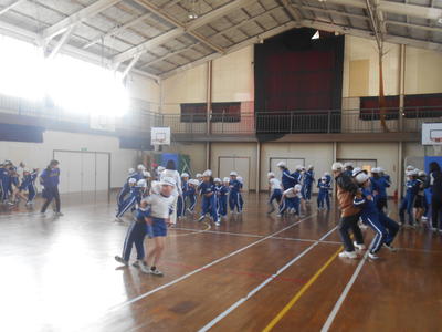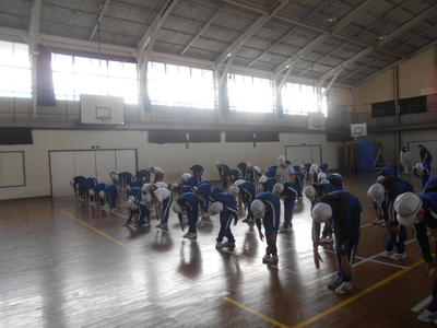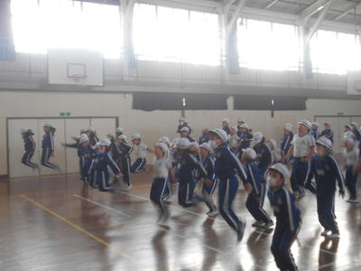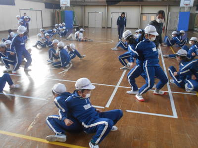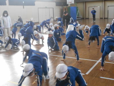 全校生が体育館でいろいろな運動をしました。寒さに負けず、みんな元気です。