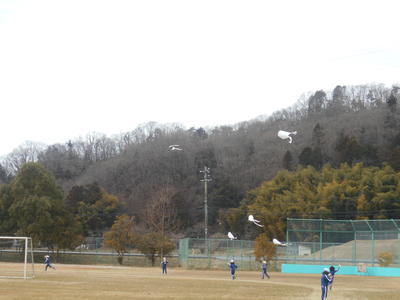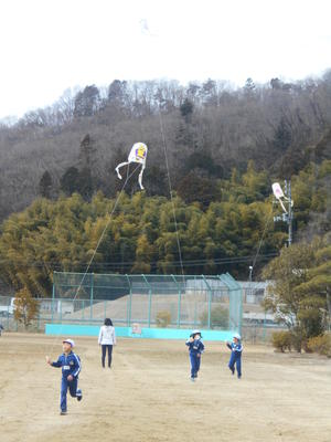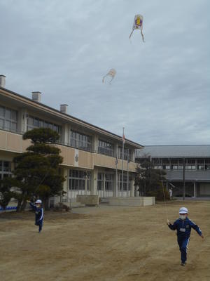 2020年2月10日 15時08分1年生がたこあげをしました。風が弱かったので、子供たちはたこを高くあげようと必死に走っていました。
