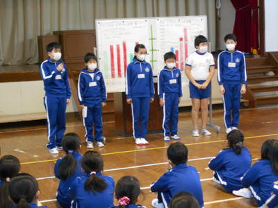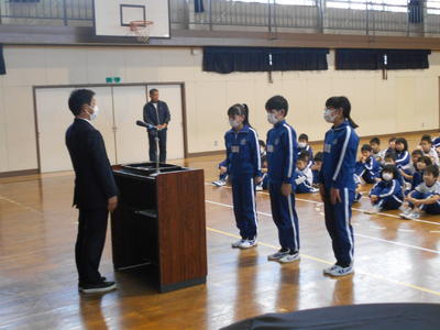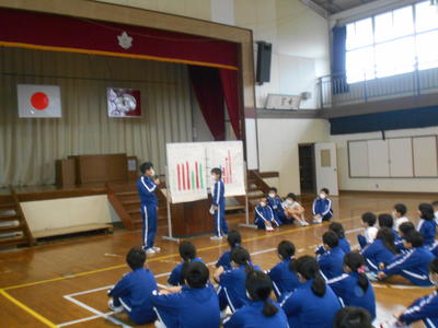 全校集会では、書き初め展や3Yジュニアの表彰を行いました。養護教諭からは「咳エチケットについて」のお話、環境委員会からは「節電・節水」へのお願いがありました。