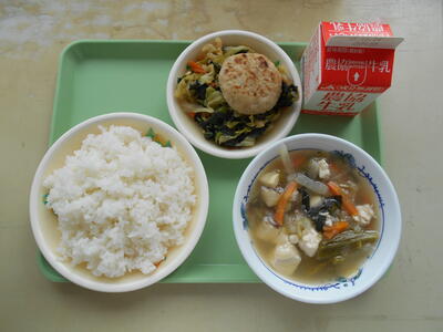 今日の給食は、ごはん 牛乳 きんぴらのつつみ焼き あおなの煮びたし たいのうしお汁です