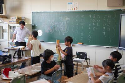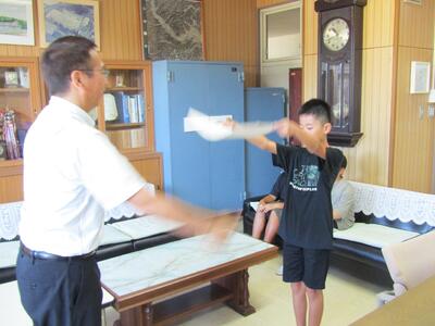 1件目は、「第69回たなばた展」に出品し、多くの子どもたちが入賞しましたが、代表として特選となった2名の児童へ伝達です。