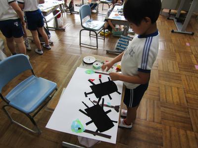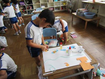 2年生は、図工で布や毛糸、ボタンなどを貼って貼り絵をつくっていました布のデザインをどこに生かそうか考えながら、楽しそうに制作していました