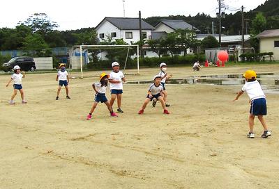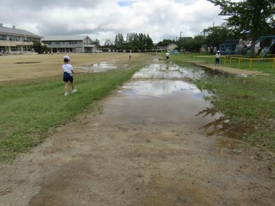 大休憩には、広く長い水たまりを避けて、子どもたちは元気に遊びました