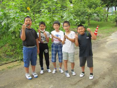 4年生のキュウリが今日は5本、実っていましたおいしそうですねお家の人と、ぜひもぎたてのキュウリ料理を楽しんでください