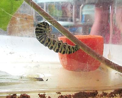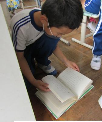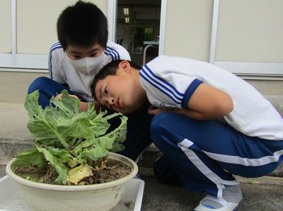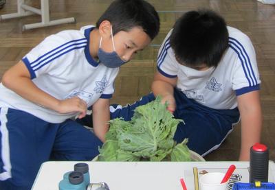 3年生で飼育しているキアゲハの幼虫が、朝からだんだん白っぽくなり、模様のある皮を脱いでサナギになっていきました子どもたちはファーブル昆虫記に書いてあることと照らし合わせながら、熱心に観察をしています