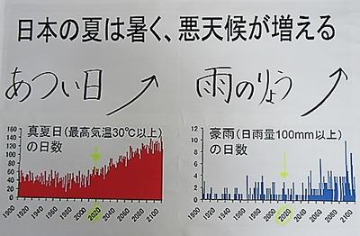 校長の話「地球温暖化の影響で引き起こされる異常気象。雨量増加で川の氾濫や高温の日が増える」