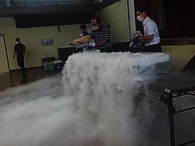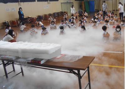 全校集会オープニングは、校長より、異常気象と地球温暖化、二酸化炭素の性質についての話のあとに、二酸化炭素をマイナス78.9度で冷やすとドライアイスになり、重い気体であることを実験で紹介しました。