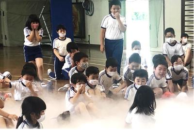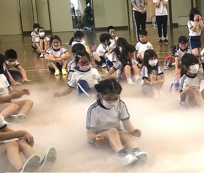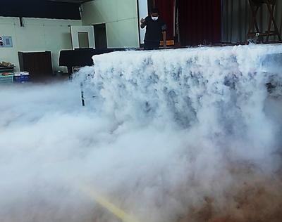 過冷霧に包まれる子どもたち足下は冷えた二酸化炭素でひんやり