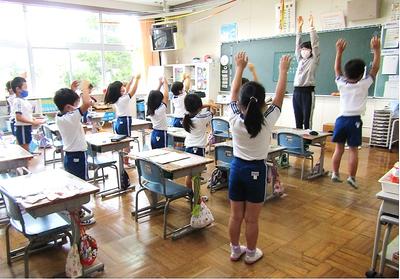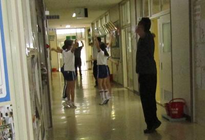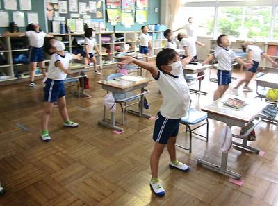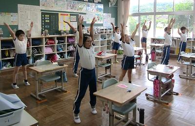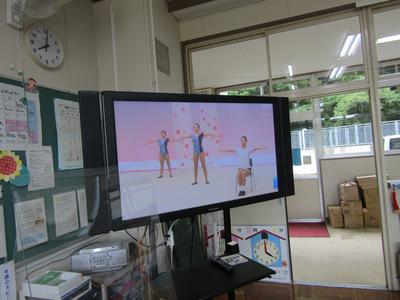 2年生は映像を見ながら正しい体操の仕方を練習しています