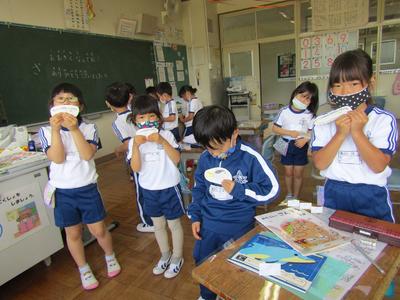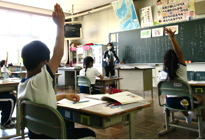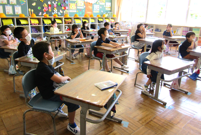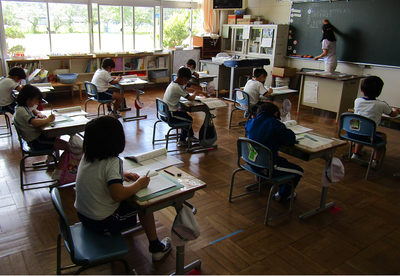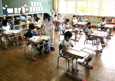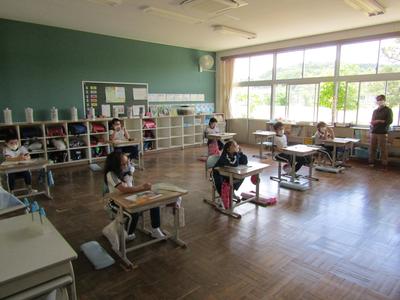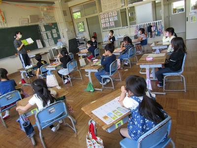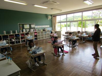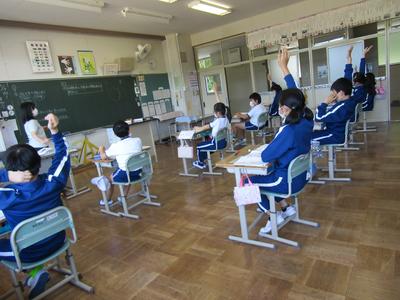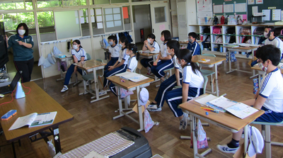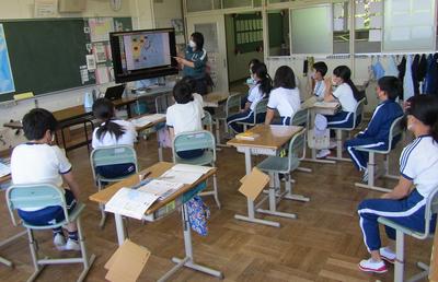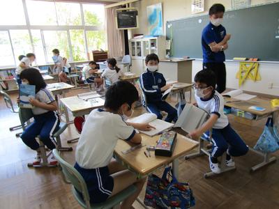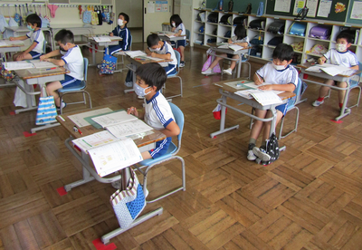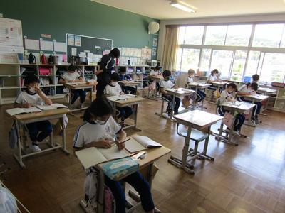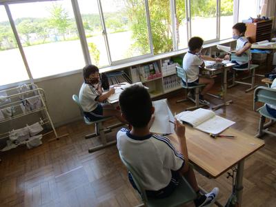 4年生は、算数で折れ線グラフの書き方を学習しています。グラフの書き方で大切なことをペアで話すときも、頭をつけずに離れて話し合っています「新しい学校生活様式」にも少しずつなじんできました