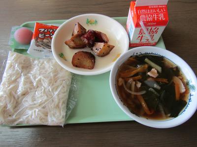 今日は、ソフト麺とかけ汁、牛乳、大学芋、ひとくちイチゴゼリー、フィッシュビーンズです