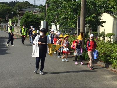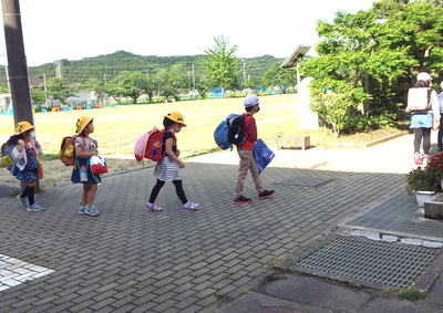 今日も地域の方々に見守られ、子どもたちは一列になって上手に登校してきました