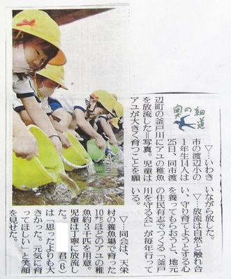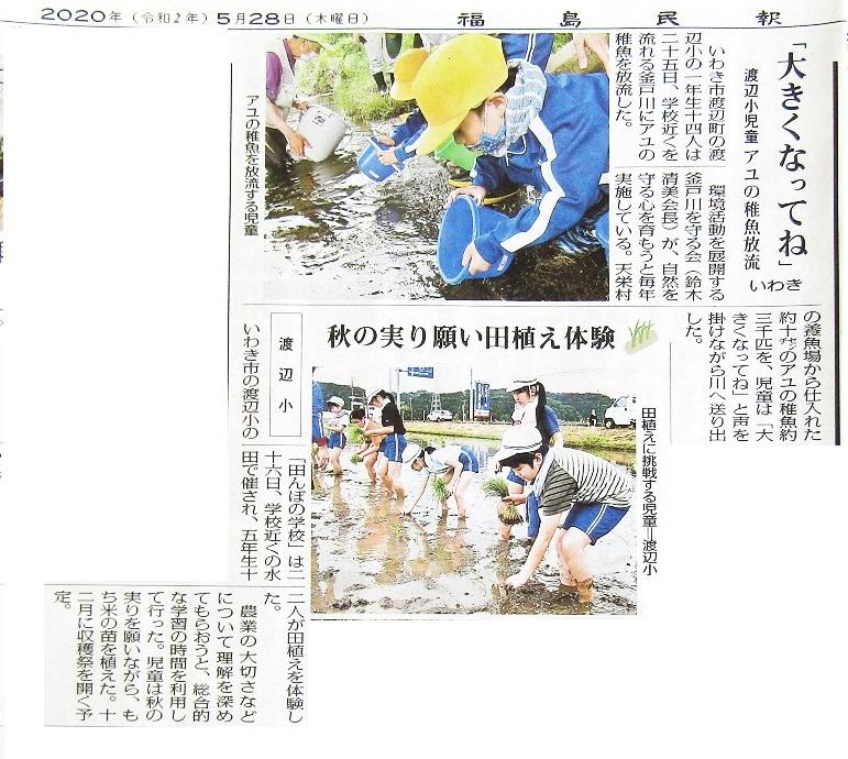 福島民報と福島民友の新聞に1年生の「アユの放流」と5年生の「田植え」の記事が掲載されました