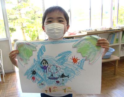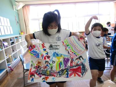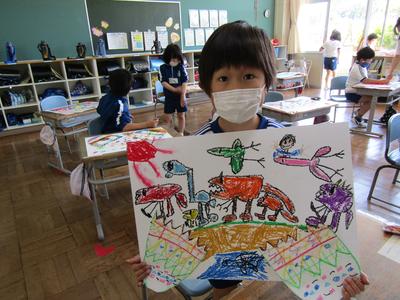 2年生は、図工「ひみつのたまご」で、たまごが割れて中から出てきたものを描いていました楽しそうですね