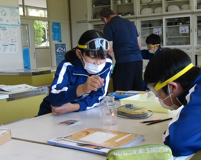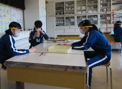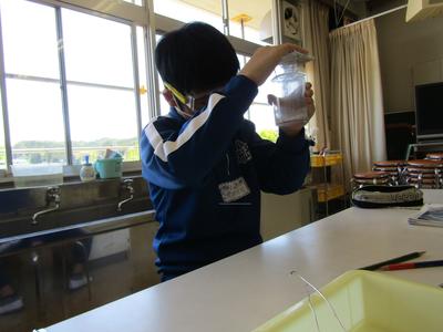 6年生は、理科「物の燃え方と空気」の学習で、木や紙を燃やしたあとに二酸化炭素がでるかどうかを実験で調べていました密にならないよう、実験グループの間をあけて学習しています