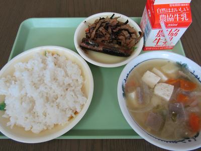 今日の給食は、一汁二菜でごはんを主食として魚・肉・大豆・いもを取り入れた主菜・副菜・汁物がそろった献立です。栄養をバランスよくとれる献立です 今日のメニューは、ご飯、牛乳、さんまのおろし煮、切り干し大根とこんぶの含め煮、豚汁です