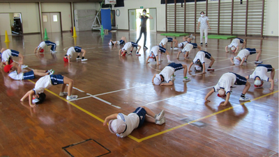 今日の2時間目の授業です1・2年生は体育の授業で、体を柔らかくする基本の運動を行っています難しいブリッジにも挑戦しました