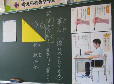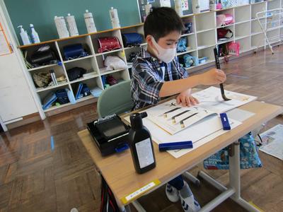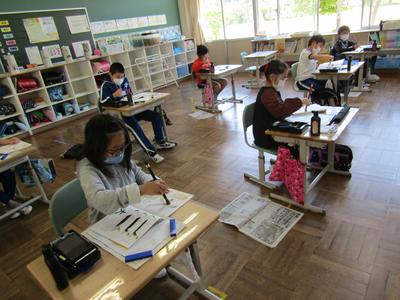 3年生は、書写です。穂先を折り紙の三角のように向けると上手にかけると教えていただきました筆運びが上手になりました