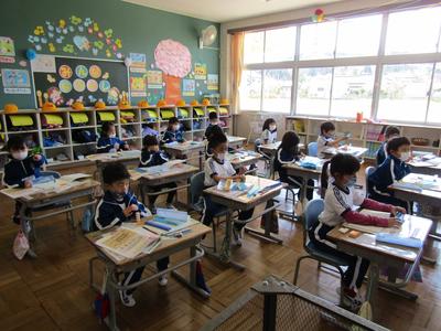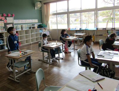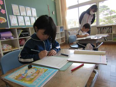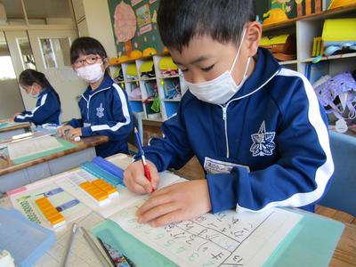 1年生は、算数「なかまづくりとかず」の学習です。ブロックを使って数えたり、赤鉛筆で文字を書いたり、楽しい小学校の授業が始まっています