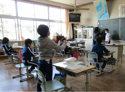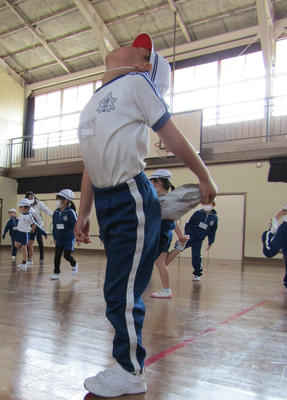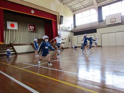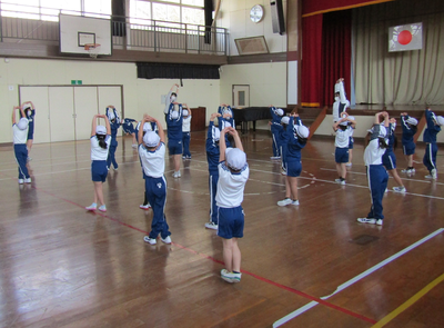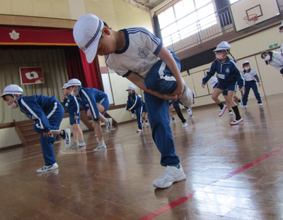 1・2年生は、合同体育です。基本の運動の後に、先生が「運動身体プログラムをやります」と話すと、子どもたちから「やったー」と歓声が運動大好きな子どもたちです