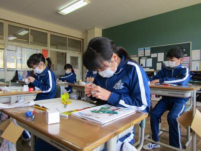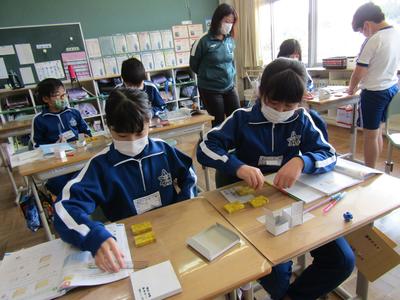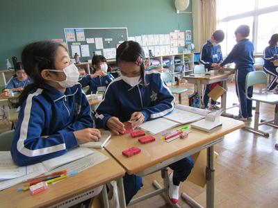 5年生は、算数で直方体と立方体作りを行っていました。みんな黙々と、展開図を切り取って立方体や直方体を作っていますこれからの学習に活用します