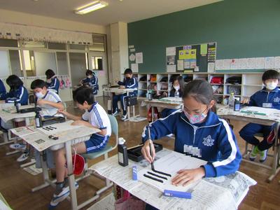 6年生は、書写の毛筆です先生の筆の運びを見ながら、筆の入れ方、運び方、止め方に気をつけてかいていました。これから「湖」の漢字一文字を学習します