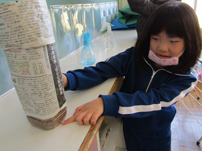 5年生は、算数で、たて4cm、よこ6cm、高さ5cmの直方体について、1立方cmの立方体を重ねて高さを実感sなせています。具体物を操作するとより理解が深まりますね