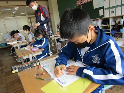 4年生は、算数で「25億を10倍、10分の1倍した数」について考えていました。子どもたちは、位の考え方もよく理解できていました学習が毎日積み上がっていきます