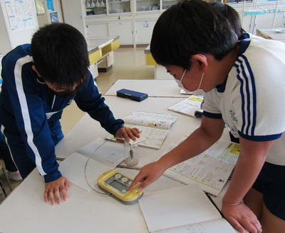 6年生は理科で物の燃え方の学習で使う実験道具の使い方を学習していました。気体検知管や酸素センサーです。次回は実際にろうそくが燃えた後の気体の変化を調べます