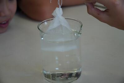 何をしているのか聞いたところ、塩を詰めたティーバッグを水に入れて、反応を見ているとのこと。