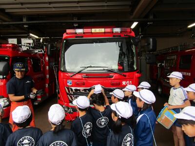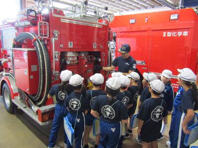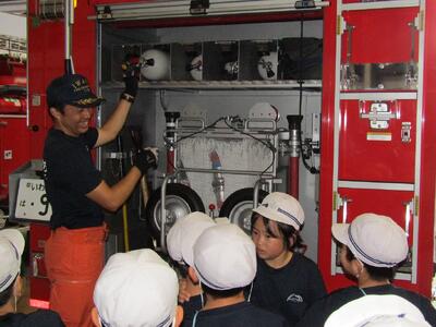 まずは、消防車のしくみや搭載されている様々な道具などについて教えていただきました。