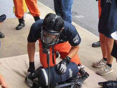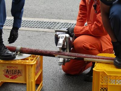 実際に、火災現場で背負うマスクとボンベや、鉄を切断したりつぶしたりする道具も実演していただきました。