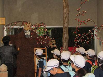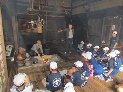 その民家を見学しましたが、子どもたちにとっては「懐かしい」というよりは「見たことがない」建物という印象だったかもしれません。中にある囲炉裏端で、薪をくべる様子も見せていただきました。