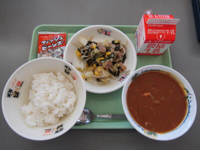 チキンカレーライス、牛乳、野菜のホットサラダ、フィッシュビーンズです。