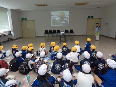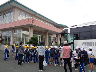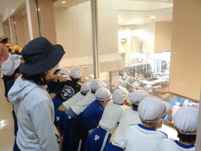 1・2年生は、生活科で、自分たちが普段食べている給食を作ってくださる小名浜給食センターを見学し、その後、三崎公園で遊んできます。三崎公園へ行くのは、せっかくバスを使っていくのだから、近くの公園で遊ぶ体験をさせてあげたいという1年担任のアイディアによるものです。低学年は、他の学年に比べ時数に余裕があるため叶ったコースです。