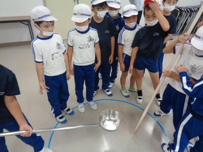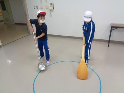 続いては、調理員さんが実際に調理で使っている巨大なしゃもじとおたま(?)を使う体験もさせていただきました。