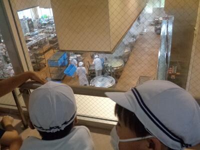 【2階からガラス越しに給食が作られていく様子を見ました。】