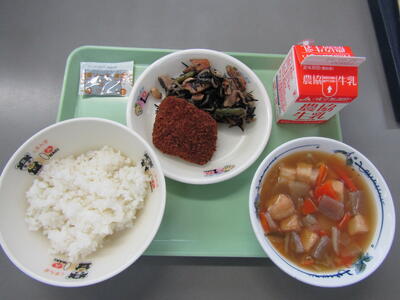 ごはん、牛乳、ひじきの油いため、かじきカツ、はちはい汁です。