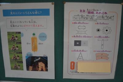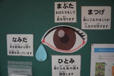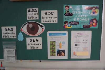 保健室の掲示物では、まぶた、まつげ、ひとみ、なみだなどの役割を説明したり、見えにくくなっている人がどんな見え方なのかを紹介したりして、目を大切にする意識を高めようとしています。